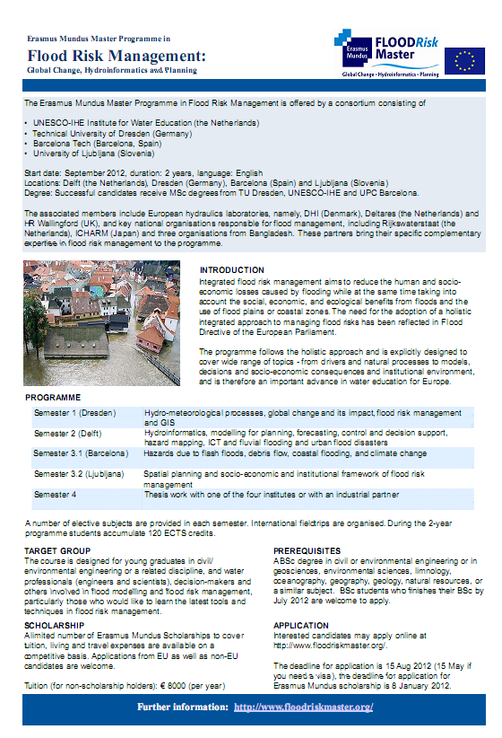 Konzorcij, sestavljen iz UNESCO-IHE (Nizozemska), TU Dresden (Nemčija), UPC Barcelona (Španija) in Univerze v Ljubljani (Slovenija), vabi k vpisu v podiplomski študij Obvladovanje poplavne ogroženosti. V teku dvoletnega študija študentje poslušajo prvi semester na TUD, drugi na UNESCO-IHE, tretji na UPC ali UL, zadnji semester, namenjen izdelavi magistrskega dela pa v eni od ustanov ali pri partnerju iz prakse. Uspešni kandidati dobijo magistrski naziv pri TU Dresden, UNESCO-IHE in UPC, Barcelona. Učni jezik je angleščina. Program se začne izvajati septembra 2012.